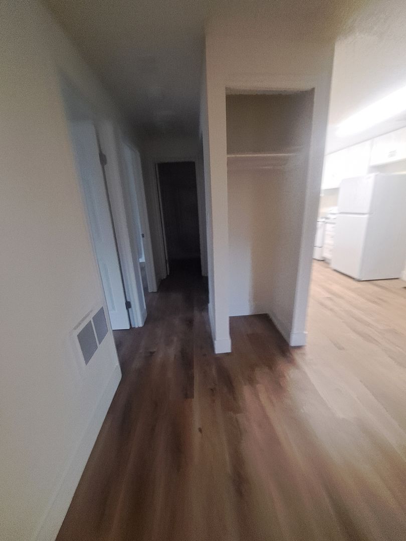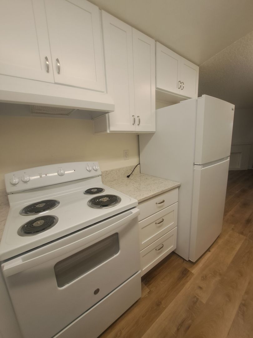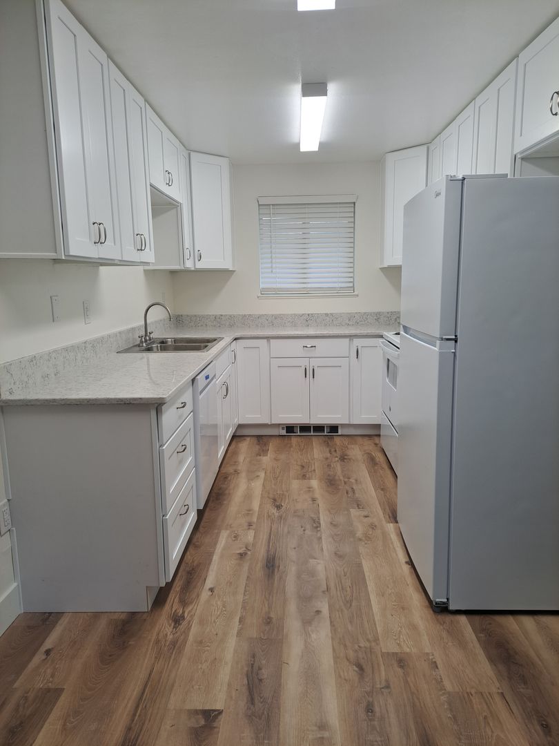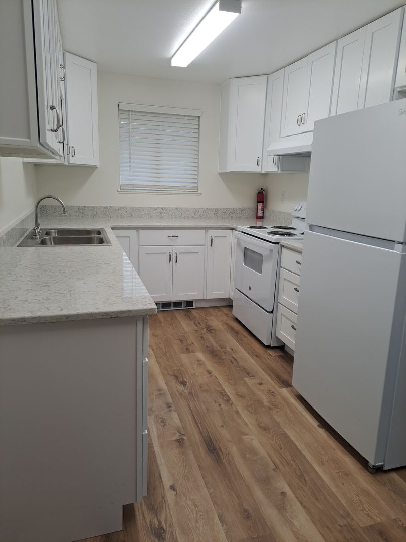 This newly remodeled two bedroom unit comes with a designated parking space. New kitchen. New floors. No carpet. Lots of cupboard space and counter space.