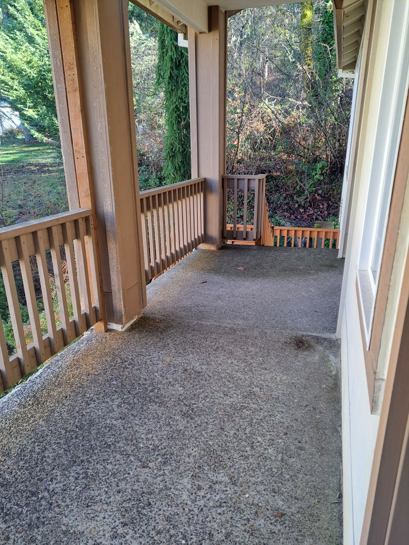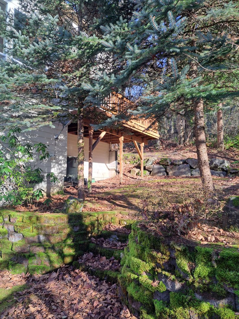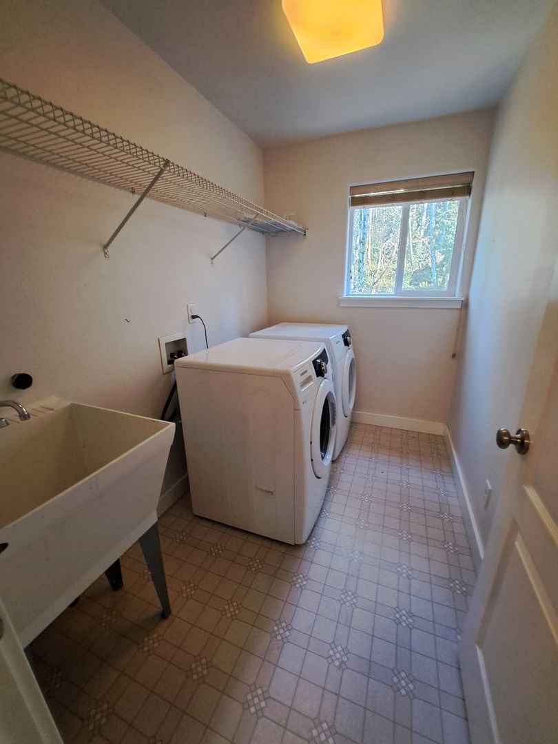 Formal dining. Formal living room with French doors to the front deck. . Fireplace in secondary living area looking out into the wooded area. Generous sized loft for office space or sitting area. Bedrooms - 1 bedroom with closet and storage space on main level, Full bath also on main floor. 4 Bedrooms up and laundry room with machines provided.